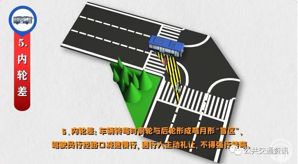 5、內(nèi)輪差:車輛轉(zhuǎn)彎時前輪與后輪形成彎月形“盲區(qū)”,駕駛員行經(jīng)路口減速慢行,遇行人主動禮讓,不得強行轉(zhuǎn)彎。