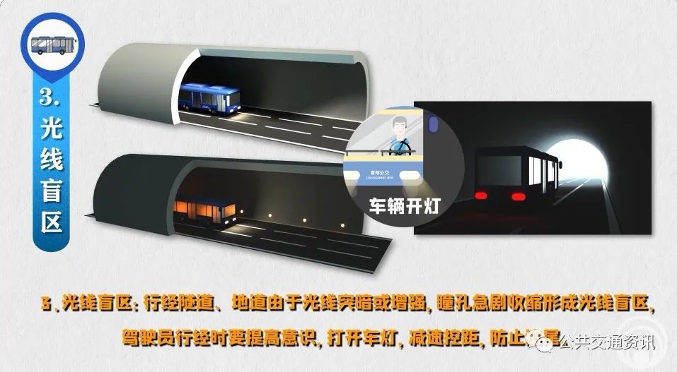 3、光線盲區(qū):行經(jīng)隧道、地道由于光線突暗或增強,瞳孔急劇收縮形成光線盲區(qū),駕駛員行經(jīng)時要提高意識,打開車燈,減速控距,防止追尾。