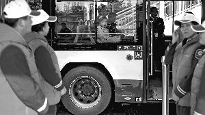 公交人下班后輪流在站臺當(dāng)起志愿者。晨報(bào)記者 王巍/攝