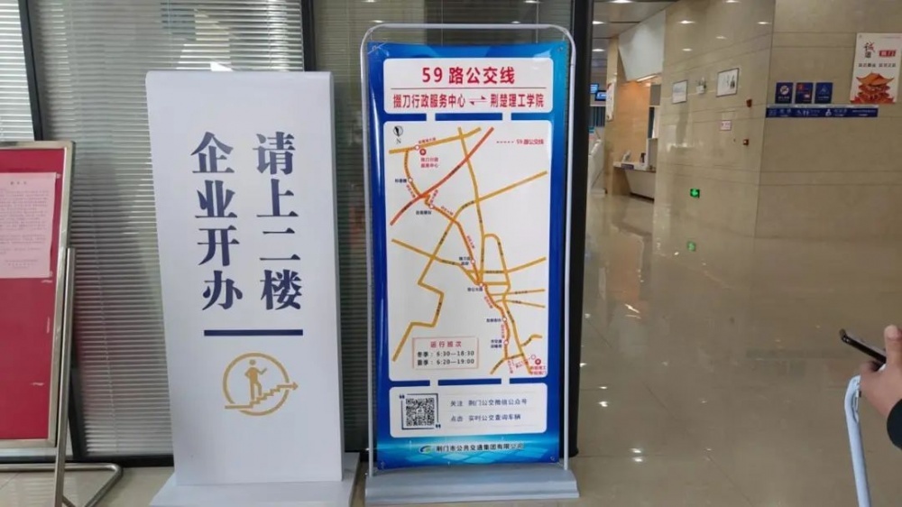 荊門(mén)高新區(qū)·掇刀區(qū)政務(wù)服務(wù)中心大廳內(nèi)59路車(chē)走向信息展牌引導(dǎo)乘車(chē)