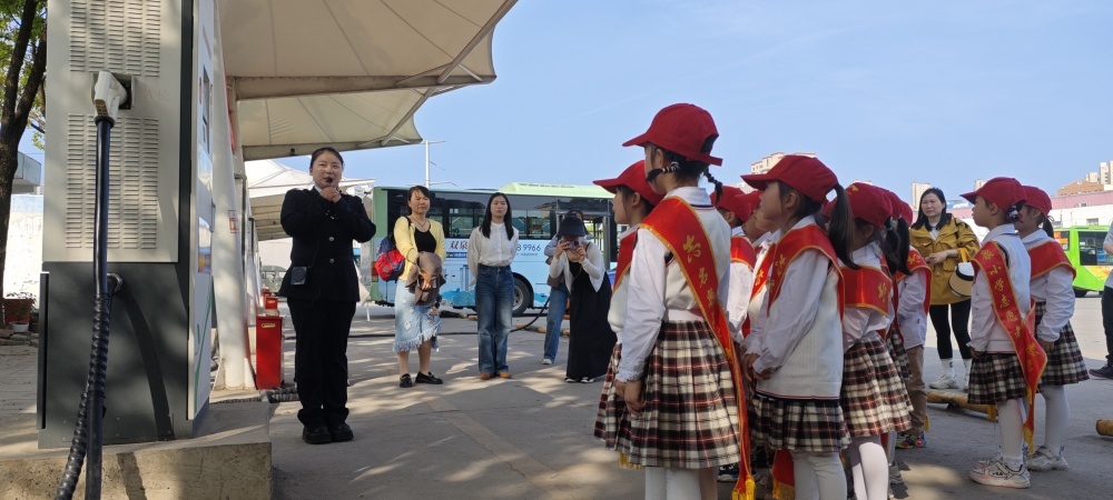 圖/在公交充電站,工作人員向同學們介紹充電樁的工作原理和純電動公交車的運行優(yōu)點。
