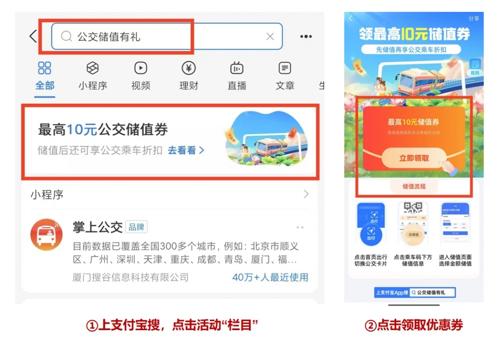 如何領(lǐng)取【儲(chǔ)值立減券】:活動(dòng)期間,上支付寶搜索【公交儲(chǔ)值有禮】或掃描下方二維碼,進(jìn)入活動(dòng)頁面,點(diǎn)擊“立即領(lǐng)取“,即可免費(fèi)領(lǐng)取公交儲(chǔ)值優(yōu)惠。