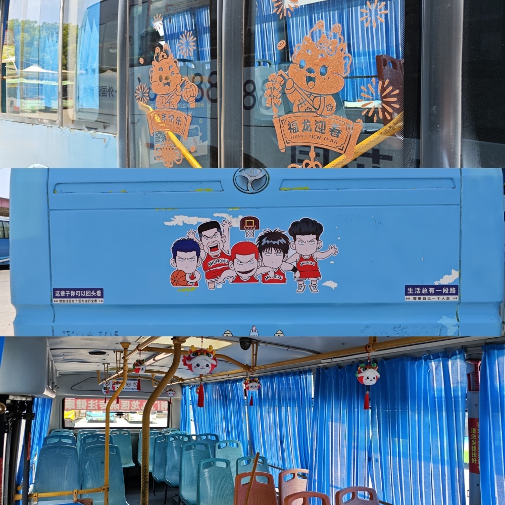2020#車(chē)還有另外幾處細(xì)節(jié),引起小編注意,上下車(chē)門(mén)處貼有卡通人物和“福龍迎春”貼紙,車(chē)尾部貼有“灌籃高手”人物貼紙和提示標(biāo)語(yǔ),車(chē)廂內(nèi)的扶手桿則掛滿(mǎn)了喜慶娃娃??吹竭@些裝飾和布置,仿佛感受到了駕駛員的熱情、認(rèn)真和細(xì)膩。
