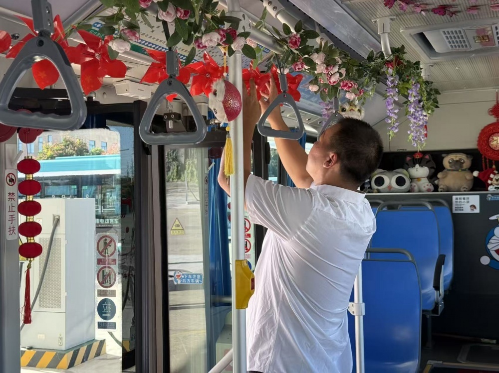 張峻峰是荊門(mén)公交2024年度“最美公交人”,他的車(chē)上總比別人多點(diǎn)“暖心”東西:駕駛座旁的小盒子里備著暈車(chē)藥、創(chuàng)可貼和折疊傘。“今年國(guó)慶,就想乘客上車(chē)能樂(lè)呵樂(lè)呵?!庇谑菑埦寰蛣?dòng)了裝飾車(chē)廂的念頭。他自費(fèi)買(mǎi)了小國(guó)旗、風(fēng)車(chē)、燈籠等裝飾,晚上在家剪剪貼貼,白天利用休息時(shí)間在車(chē)上裝飾。張峻峰的行動(dòng),也是荊門(mén)公交服務(wù)提升的一個(gè)縮影。