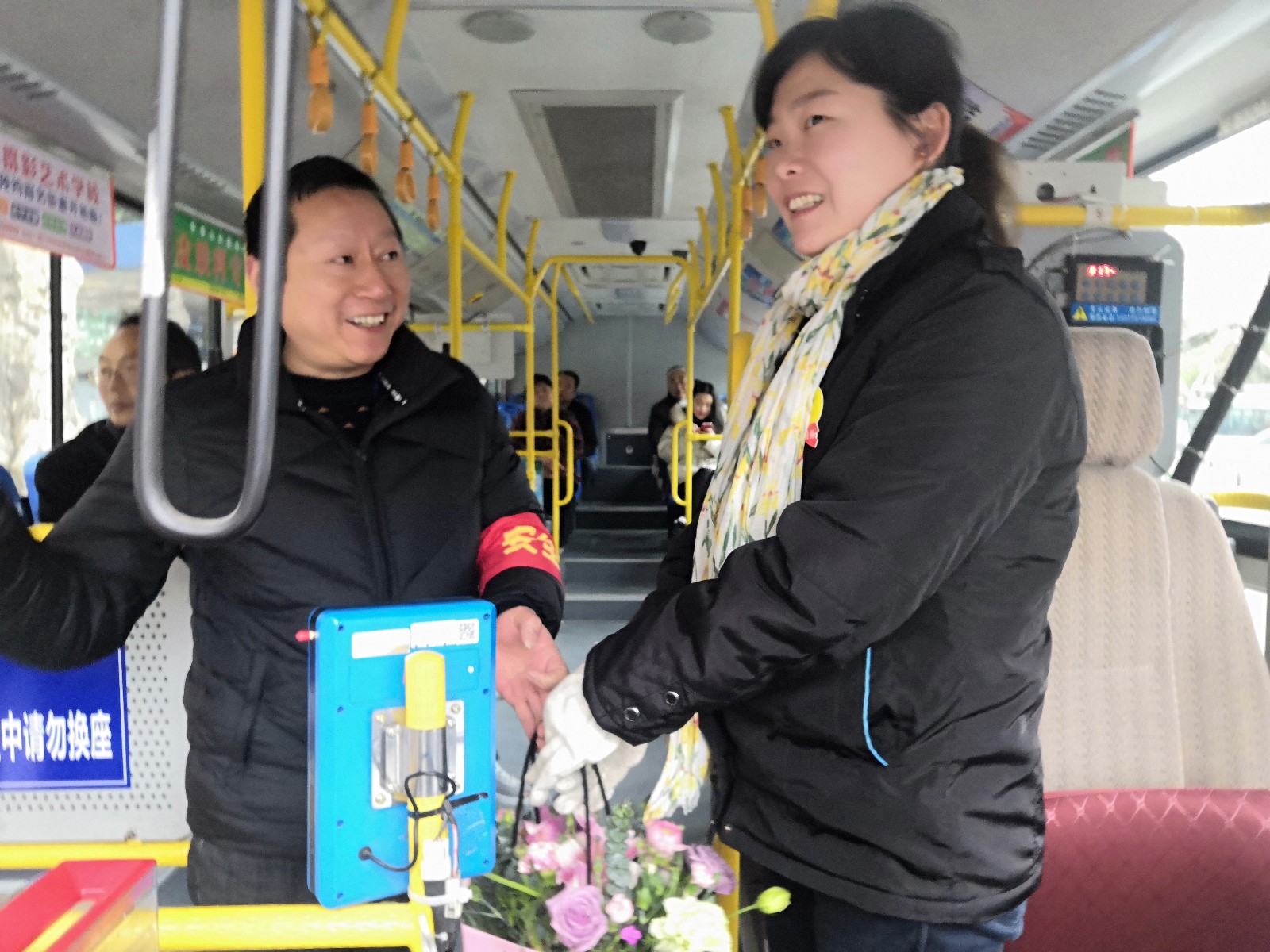 “我代表公司全體男職工,祝你們節(jié)日快樂,永遠(yuǎn)美麗!!這籃鮮花送給你~”公交信息技術(shù)部男職工羅皓這樣說道,并將一籃鮮花送到正在跑班的公交女駕駛員蘇純菊手中。面對(duì)這突來(lái)的鮮花和祝福,蘇純菊滿臉驚喜和溫馨,“謝謝,謝謝你們”在道謝聲中,關(guān)上車門,微笑著駛向下一站。