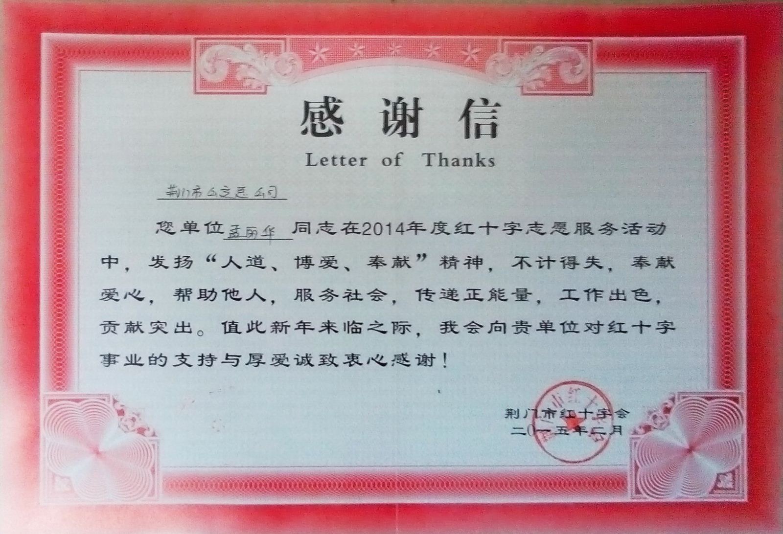 近日,集團(tuán)公司收到一封來自市紅十字會對荊門公交職工孟麗華的感謝信,內(nèi)容為孟麗華同志在2014年度紅十字志愿服務(wù)活動中,發(fā)揚(yáng)“人道、博愛、奉獻(xiàn)”精神,不計得失,奉獻(xiàn)愛心,幫助他人,服務(wù)社會,傳遞正能量,工作出色,貢獻(xiàn)突出。
