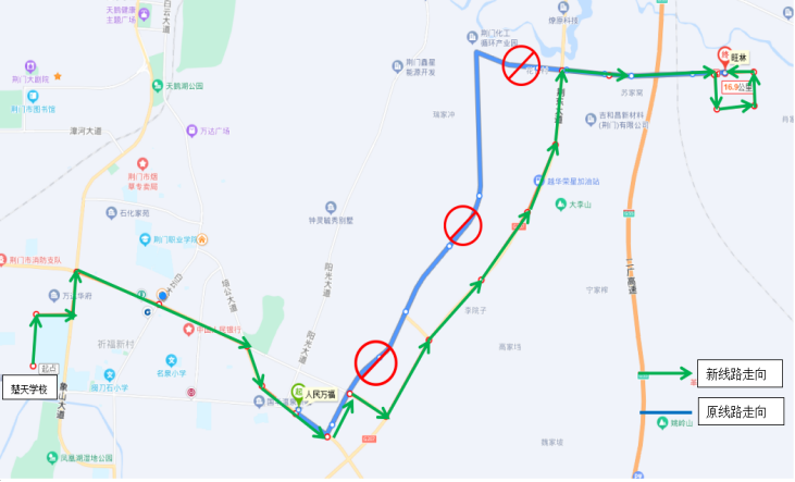 一.優(yōu)化調(diào)整33路公交線路走向 ◆首末站:楚天學(xué)?!郑ㄐ】的下繁保?/p> ◆首末班時(shí)間:6:50—17:45 ◆線路走向:響嶺路—運(yùn)動(dòng)公園路—象山大道—深圳大道—培公大道—荊和大道—深圳大道—荊東大道—興化三路—格林北路—興化四路—小康南路 ◆停靠站點(diǎn):楚天學(xué)校、雙喜街辦、運(yùn)動(dòng)公園路、萬(wàn)達(dá)廣場(chǎng)、掇刀檢察院、掇刀法院、掇刀公安分局、南城明珠、中國(guó)人民銀行、市氣象局、襄荊高速、雙泉社區(qū)、人民萬(wàn)福商貿(mào)城、人民一品花園、虎頭山、殯儀館、馮廟村、固潤(rùn)科技、東方雨虹、圣通石化、荊東消防、荊東大道興化五路口、潤(rùn)都制藥、興化三路西、興化三路中、興化三路盈德氣體、紐蘇萊、旺林、興化四路、小康南路北。 ◆取消原33路途經(jīng)荊和大道等路段站點(diǎn):荊和大道南、陽(yáng)光五路、陽(yáng)光四路、陽(yáng)光三路、化工產(chǎn)業(yè)園行政大樓。 二.優(yōu)化調(diào)整69路公交發(fā)班時(shí)間 ◆調(diào)整前 園博園東門(mén)發(fā)班時(shí)間:6:40、7:40、15:30、16:30、17:15 玲瓏輪胎發(fā)班時(shí)間:7:30、8:30、16:30、17:30、18:00 ◆調(diào)整后 園博園東門(mén)發(fā)班時(shí)間:6:40、7:20、15:30、16:30 玲瓏輪胎發(fā)班時(shí)間:7:30、8:20、12:20、16:20、17:30