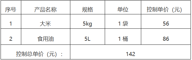 預(yù)算金額:本次詢價對大米、食用油的單價、合計總單價進行詢價,在各分類報價不超過控制單價(含稅)的前提下,控制總單價142元,超過此采購預(yù)算的報價無效。